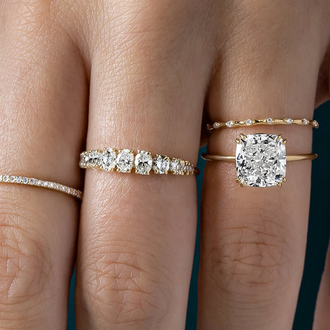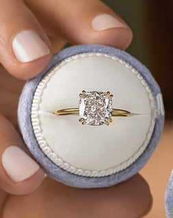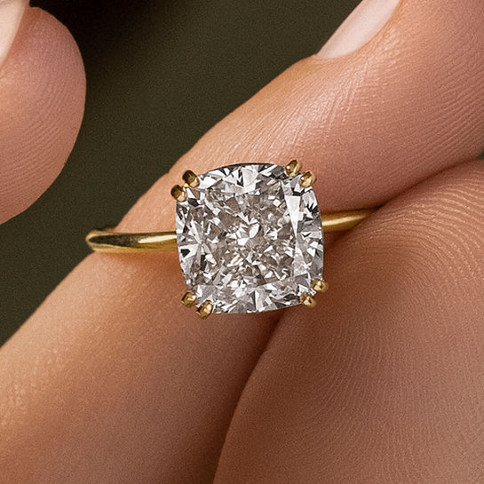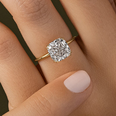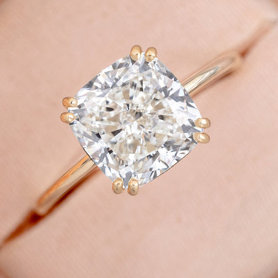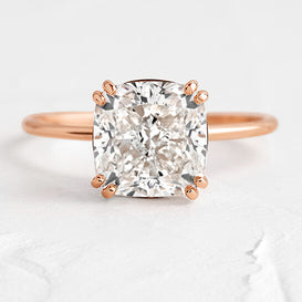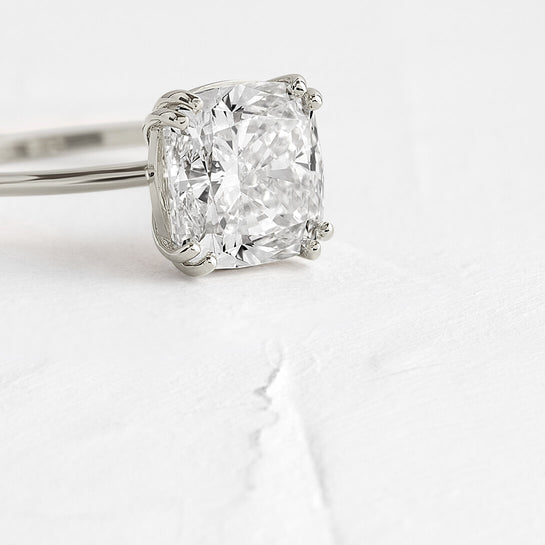 The Filament Collection lights up a classic solitaire setting. This version of the Filament Ring features your choice of cushion cut focal diamond in an open basket setting with four double prongs set on a delicate band available in 14k gold or platinum. With this minimalist design, flaws have nowhere to hide and our commitment to excellence is on full display. Our dedication to precise and meticulous craftsmanship allows the Filament Ring to shine through perfect execution and elegant simplicity. Delicate double prongs are what set this collection of solitaires apart. Metal appears to thread diamond to band, prongs anchoring statement stone to setting. Our expertise with delicate jewelry ensures that the delicate double prongs maintain their contour. This unique setting appears that it has been carefully sewn, evoking this collection's namesake for a single thread.