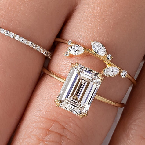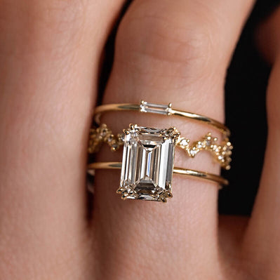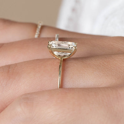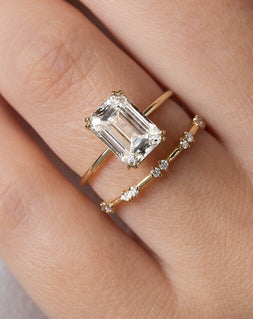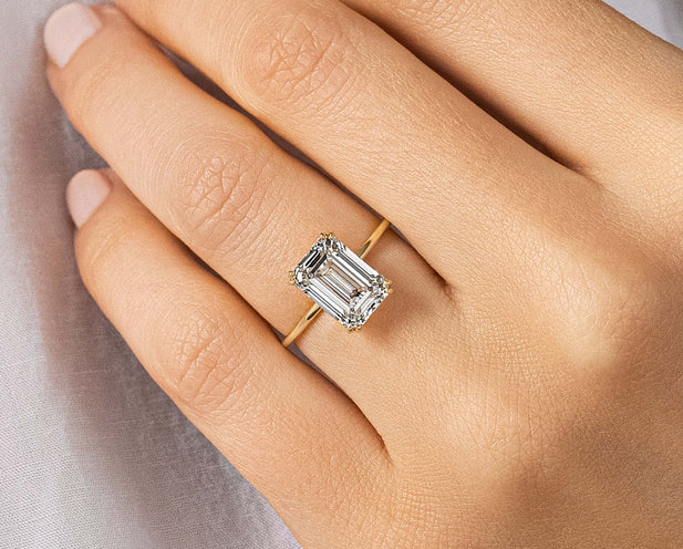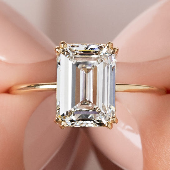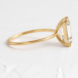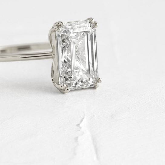 The Filament Collection lights up a classic solitaire setting. This version of the Filament Ring features your choice of emerald cut focal diamond in an open basket setting with four double prongs set on a delicate band available in 14k gold or platinum. With this minimalist design, flaws have nowhere to hide and our commitment to excellence is on full display. Our dedication to precise and meticulous craftsmanship allows the Filament Ring to shine through perfect execution and elegant simplicity. Delicate double prongs are what set this collection of solitaires apart. Metal appears to thread diamond to band, prongs anchoring statement stone to setting. Our expertise with delicate jewelry ensures that the delicate double prongs maintain their contour. This unique setting appears that it has been carefully sewn, evoking this collection's namesake for a single thread.