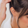 The drilled, lab-grown pear cut diamond appears to be suspended in mid-air, connected to a gold chain that loops below and behind the ear. These earrings are simple yet unexpected.