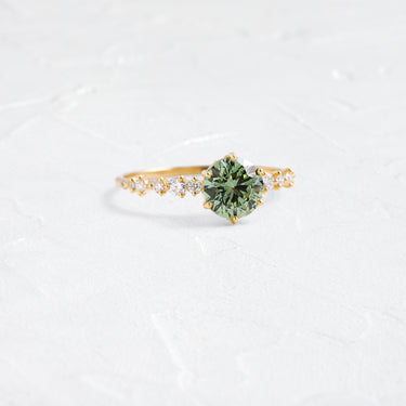 The Edison Collection evokes a spark of inspiration. Equal parts dramatic and whimsical, The Edison Ring features twelve round cut diamonds, thoughtfully and symmetrically scattered across a band of 14k gold. A round cut green diamond focal rests at the band’s center, with smaller diamonds appearing to pulse as they grow and shrink along the curve of the delicate band. Four hidden accents, two on either side of the focal stone, are set where prong meets basket, radiating outward in a flash of diamond. These accent diamonds float, bringing a sense of weightlessness and sparkle to an often unremarkable angle. Our expertise with dynamic accent stones ensures that each diamond is set securely with the strength of a future heirloom despite their delicate links to the setting. Through diamond brilliance, the Edison Ring captures a moment of innovation and the reverberations that echo in the afterglow.