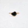 Inspired by our beloved Lady’s Slipper Ring, the Evenfall Ring brings contemporary drama to an antique-inspired bezel set engagement ring. Featuring a towering bezel setting in 14k gold, our dedication to superior craftsmanship and master goldsmithing is displayed in the sculpted edges and delicate framework surrounding this east-west facing pear cut bluish-green sapphire. Asymmetrical triangular tapers flank the focal stone, accented by four diamonds on one side and one diamond on the other. The bubbled metal accompanying the accent work is sharply contrasted by the impossibly smooth sides of the bezel setting itself. Because the band reaches its maximum width where taper meets focal stone, your eye is drawn directly to the raised setting, even looking from a top-down view. With vertical movement, the Evenfall Ring evokes an impending moonrise just as darkness begins to fall.