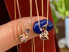 The Foothold Necklace dangles delicately. Two warm-toned pear cut sapphires face away from one another at a gentle angle. Two round cut diamonds bridge the gap between the pear cut diamonds, and the composition hangs from a box chain of solid 14k yellow gold. The dangling pear cut sapphire is set in a slender bezel setting, while the other is prong set. Because the settings of the focal stones are connected by a slender bar of 14k gold, from a slight distance, the warm sapphires appear to float apart in shared weightlessness. The Foothold Necklace in warm Sapphire is limited edition.