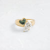 The Heart to Heart Collection was designed for Mother’s Day, capturing the beauty of connection. This Heart to Heart Ring features a green heart cut diamond in a slender bezel setting gently overlapping a white pear cut diamond. The tandem focal stones rest on a wide, round band of 14k yellow gold that tapers as it wraps behind your finger. Both focal stones break the frame of the band, the heart cresting above and the pear dipping below. This dynamic setting and the slight overlap of the focal stones bring a delicate depth to the composition and add dimension to this design. Our commitment to high quality craftsmanship means this slender bezel setting beautifully navigates from curves to angles. The Heart to Heart Collection began as a personal project: a duo of complementary heart cut stud earrings designed by founder Melanie Casey when her daughter asked for "matching heart earrings" for her sixth birthday. This Mother’s Day drop grew from Melanie’s inspiration, becoming the collection of earrings, necklaces, and rings you see today. Carry the special bond between you and your little one with a sentimental future heirloom. Pair your Heart to Heart Ring with a set of Heart to Heart Bezel Studs, Green Diamond for your child.