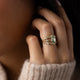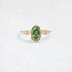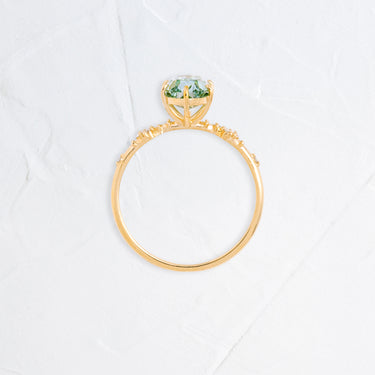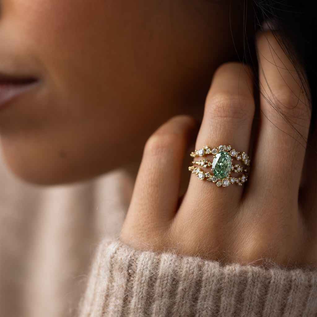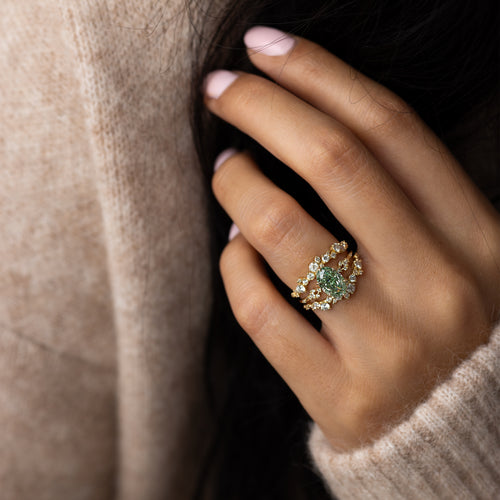 The Myriad Ring combines weightless accents with negative space to create dynamic sparkle. This engagement ring brings together a myriad of bright white diamonds in an intentional cluster surrounding the oval cut green focal diamond on a delicate band of 14k yellow gold. Our proficiency with delicately set diamond accents is evident in this complex cluster. Two round cut diamonds anchor the accents while two more diamonds split the band, creating a small pool of negative space. More accent diamonds sparkle along the band, carrying diamond brilliance to the moment the band wraps behind your finger. Despite appearing to be held together by nothing other than gravity, each diamond cluster is set with the strength of a future heirloom. With understated complexity, the Myriad Ring bridges the gap between simplicity and drama.