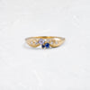 The Pinched Band in Lilac features a 14k yellow or white gold pinched dome band, one asscher cut lilac sapphire, and two round cut, blue sapphires. These focal sapphires are accented by a sprinkling of five white diamond accents that are set into the bubbled band. Because the band tapers toward the focal cluster, this delicate composition of stones appears to be simultaneously floating and holding the pinch together. Our team of master goldsmiths ensure that the sculpted band crests with grace and balance while maintaining the strength of a future heirloom. The Pinched Band in Lilac is limited edition.