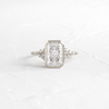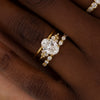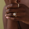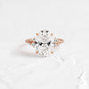 With a singular design and expert craftsmanship, The Snowdrift Collection mirrors the gentle drift of snowfall in diamond. This version of our bestselling Snowdrift Ring features your choice of oval cut focal stone in an open basket setting, accented by ten natural diamonds on a delicate band in 14k gold or platinum. Dynamic and balanced, side stones are set in a proportional gradient of size and height. This flurry of accent diamonds appears to drift along the band, drawing eyes to the focal stone and capturing a moment of movement. The symmetrical setting centers an oval statement stone, grounding the floating accents. A defining Melanie Casey design, The Snowdrift Collection recalls the all-encompassing stillness of looking out a winter window, punctuated only by the silent veil of falling snow.