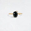 With a completely unique composition of accent diamonds, the To A Flame Ring draws you in, truly like a moth to a flame. This version features an oval cut green-blue Australian sapphire focal resting in an open basket setting on a delicate band of 14k yellow gold. The setting is accented by six small diamonds, all seemingly magnetized by the statement stone. These accents radiate outward, barely connecting to the edge of the band or curve of the setting. Our expertise with setting unique and intricate accent stones ensures that the delicate stones are secure despite appearing to be held by nothing more than gravitational pull. Like the perforated glow of summer night porch lights, the To A Flame Ring celebrates what calls to you and what brings you light.