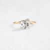 With a completely unique composition of accent diamonds, the To A Flame Ring draws you in, truly like a moth to a flame. This version features your choice of asscher cut focal diamond resting in an open basket setting on a delicate band of 14k gold or platinum. The setting is accented by six small diamonds, all seemingly magnetized by the statement stone. These accents radiate outward, barely connecting to the edge of the band or curve of the setting. Our expertise with setting unique and intricate accent stones ensures that the delicate stones are secure despite appearing to be held by nothing more than gravitational pull. Like the perforated glow of summer night porch lights, the To A Flame Ring celebrates what calls to you and what brings you light.