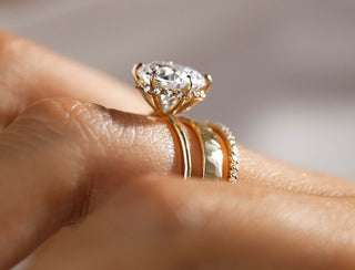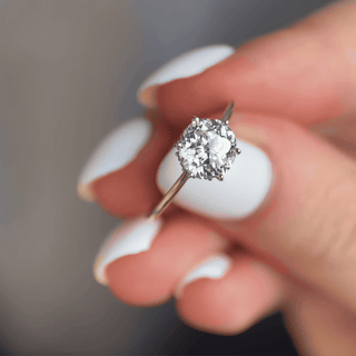 Shown here with a 3ct. round cut diamond, a hidden halo of 1mm diamonds surrounds your choice of focal diamond, and the number of accents is customized to fit your stone’s cut and carat weight.