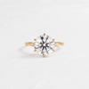 The Trestle Ring, while named for the architectural framework, is equal parts structural and decorative. This ring features your choice of round cut focal stone resting in an open basket setting on a slender band of 14k gold or platinum. The band intentionally twists, making way for three small accent stones on either side of the setting. The band then delicately tapers as it approaches the focal stone. Our commitment to superior craftsmanship means that despite accents, tapers, and braiding, the ring is crafted with the strength of a future heirloom. Melanie’s deliberate design creates a balanced composition, the diamond accents, twisted band, and slender taper work in tandem rather than overpowering one another. The Trestle Ring is a unique reminder of the support systems that overlap and enable you to thrive.